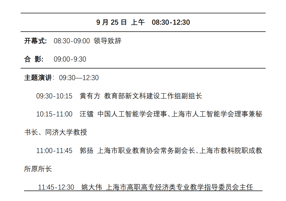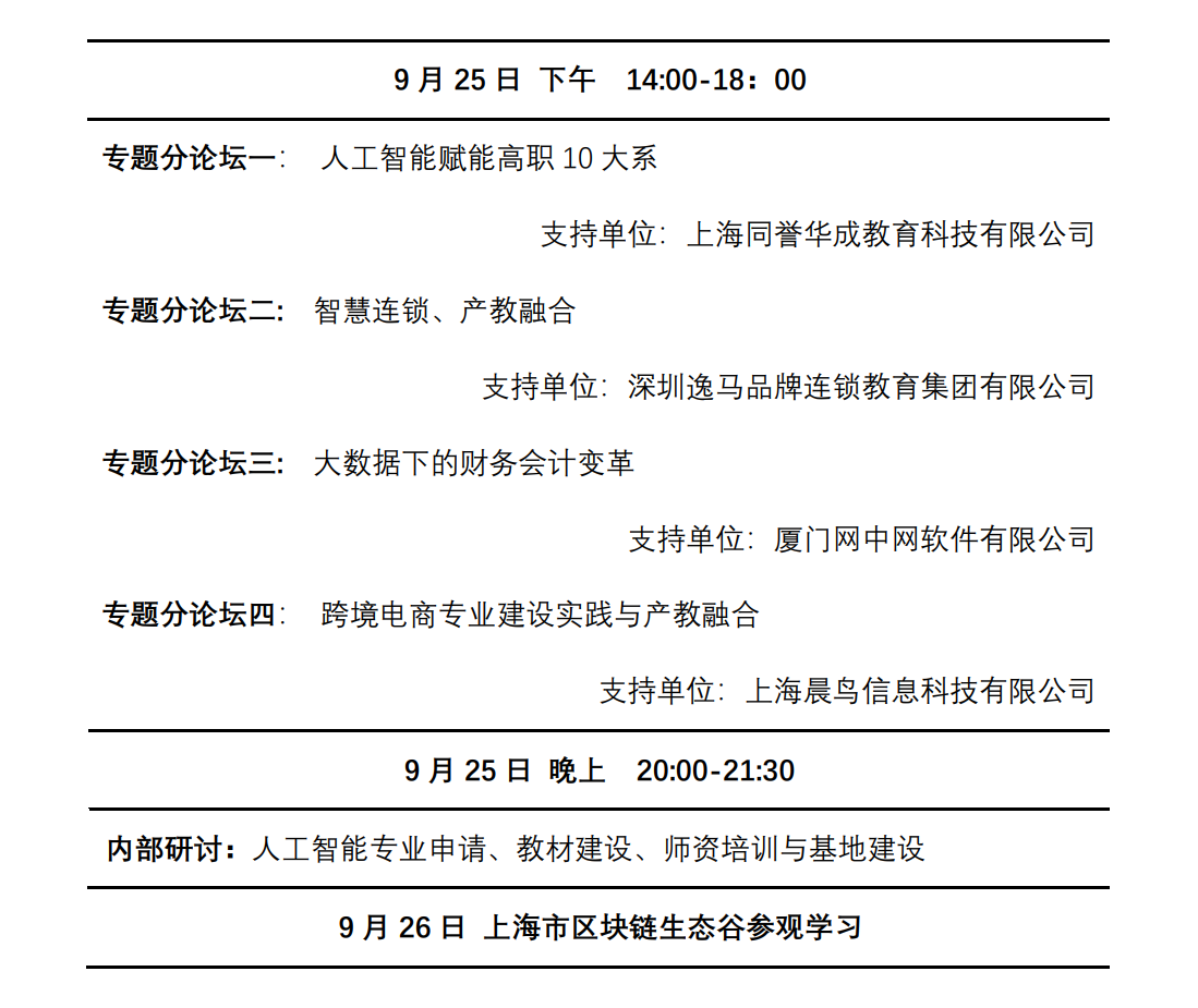 尊敬的专家、老师,您好! 为了推进新文科建设与发展,我们定于2021年9月24日-26日举办“新文科·人工智能赋能高职新目录专业群建设”全国研讨会,诚邀各专业群相关专家、老师光临! 主办单位: 上海市人工智能学会 上海市高职高专经济类专业教学指导委员会 复旦大学出版社 支持单位: 上海同誉华成教育科技有限公司 深圳逸马品牌连锁教育集团有限公司 厦门网中网软件有限公司 上海晨鸟信息科技有限公司 会议背景: 2020年11月3日,由教育部新文科建设工作组主办的新文科建设工作会议在山东大学召开。会议研究了新时代中国高等文科教育创新发展举措,发布了《新文科建设宣言》,对新文科建设作出了全面部署。新文科建设要全面把握世界百年未有之大变局的发展大势,面对科技革命和产业变革带来的新机遇和新挑战,主动引领世界高等教育变革。 2021年3月17日,教育部印发了《职业教育专业目录(2021)年》(以下简称《目录》),这是贯彻党的十九届五中全会提出的“构建高质量教育体系”精神,落实国务院“职教20条”要求的具体举措。新版《目录》立足新发展阶段,全面落实“十四五”规划和2035年远景目标的战略部署,对接现代产业体系,对接新经济、新业态、新技术、新职业,创建高质量职教体系,提升人才供给质量。 2021年7月8—10日,世界人工智能大会在上海召开,吸引了全球的目光,其中大会重点探讨了AI与财务领域在未来如何实现高度交融,AI赋能大学教育,以及AI技术如何应用到财务行业以帮助财会业务实现智能化转型,并深度思考财务智能化如何为城市数字化转型创造价值,财务数字化如何为数字中国建设精准赋能。 在此背景下,由新文科建设工作组、上海市人工智能学会、上海市高职高专经济类专业教学指导委员会的相关领导和专家召集并组织召开本次全国教学研讨会。本次会议将邀请:教育部新文科建设工作组副组长黄有方教授、中国人工智能学会理事汪镭教授、中华职业教育社常务理事郭扬教授、上海市高职高专经济类专业教学指导委员会主任姚大伟教授等专家和知名学者做主题演讲,以及研讨活动。会议为期两天,其中第二天为实践参观——上海市区块链生态谷。 会议重要,请各院校接到通知后积极参会。 会议主题: 新文科·人工智能赋能高职新目录专业群建设 参会人员: 高职院校各专业群相关负责人及领军人物 会议时间: 2021年9月24—26日。 9月24日全天报道,25-26日正式会议。 会议地点: 上海,复旦大学邯郸路校区。 联系方式: 郭峰:18516351773(微信号同手机号) 李佩锦:15615930857 注意事项: 本次会议不收取会务费,住宿交通费用自理。 已发送回执的代表请注意查收邮件(以回执邮件为准),大会将向拟邀请参会代表发出正式邀请函,以此作为注册报到凭证。大会期间正值旅游高峰期,请您务必尽快预定酒店,以免耽误行程。 上海市人工智能学会 上海市高职高专经济类专业教学指导委员会 复旦大学出版社 2021年7月10日 会议初步议程安排 推荐酒店一:Zsmart智尚酒店(上海五角场复旦大学店) 价格如下:普通标间/大床房 340元/天,高级大床房 390/天,家庭/行政套房420元/天。 推荐酒店二:上海五角场大柏树亚朵酒店 价格如下:普通标间/大床房 550元/天。 ——期待您的报名—— |