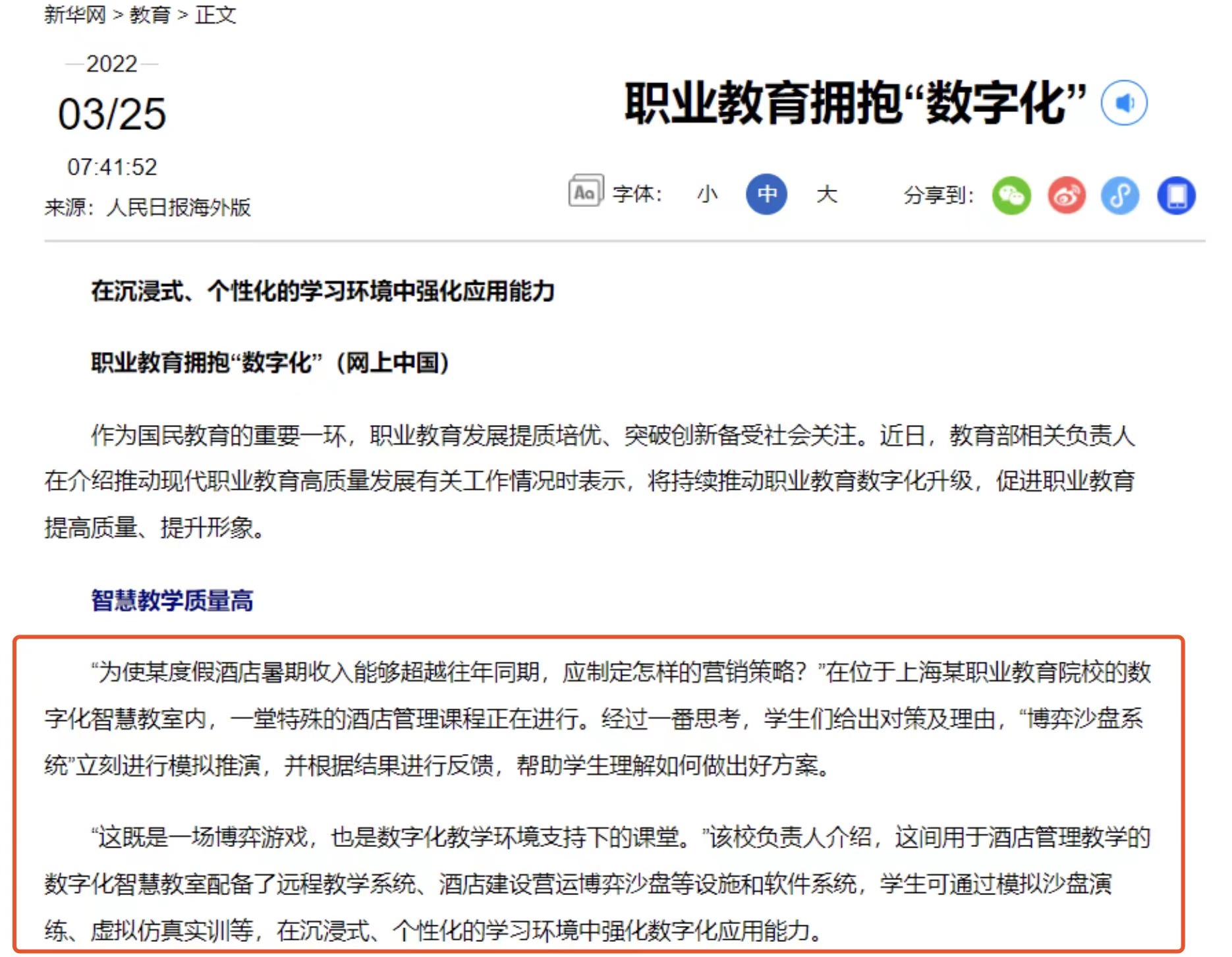 3月25日,人民日报海外版发文“在沉浸式、个性化的学习环境中强化应用能力,职业教育拥抱“数字化””。文章指出,作为国民教育的重要一环,职业教育发展提质培优、突破创新备受社会关注。教育部相关负责人在介绍推动现代职业教育高质量发展有关工作情况时表示,将持续推动职业教育数字化升级,促进职业教育提高质量、提升形象。在如 何提高教学质量方面,文章以晨鸟科技酒店管理营运博弈沙盘为例,介绍了学校如何通过沙盘演练、虚拟仿真实训等沉浸式、个性化学习强化学生的数字化应用能力。 以下是文章的全文: 作为国民教育的重要一环,职业教育发展提质培优、突破创新备受社会关注。近日,教育部相关负责人在介绍推动现代职业教育高质量发展有关工作情况时表示,将持续推动职业教育数字化升级,促进职业教育提高质量、提升形象。 智慧教学质量高 “为使某度假酒店暑期收入能够超越往年同期,应制定怎样的营销策略?”在位于上海某职业教育院校的数字化智慧教室内,一堂特殊的酒店管理课程正在进行。经过一番思考,学生们给出对策及理由,“博弈沙盘系统”立刻进行模拟推演,并根据结果进行反馈,帮助学生理解如何做出好方案。 “这既是一场博弈游戏,也是数字化教学环境支持下的课堂。”该校负责人介绍,这间用于酒店管理教学的数字化智慧教室配备了远程教学系统、酒店建设营运博弈沙盘等设施和软件系统,学生可通过模拟沙盘演练、虚拟仿真实训等,在沉浸式、个性化的学习环境中强化数字化应用能力。 近年来,“科技+教育”的快速发展为职业教育数字化奠定了良好的资源与技术基础,越来越多的职业院校根据专业教学需求,推出智慧教室、虚拟仿真实验教学中心等数字化教学平台,打造良好的数字化教学环境。部分院校和在线教育平台还依托物联网、人工智能等技术推出“数字课程+电子教材”的教学模式,进一步提升职业教育的数字化程度。 教育部职业教育与成人教育司司长陈子季表示,教育部将打造职业教育数字化“1+5”体系,即职业教育决策大脑系统和决策支持中心、专业教学资源中心、精品在线开放课程中心、虚拟仿真实习实训中心、职业学校治理能力提升中心,以数字化转型整体驱动教学模式和治理方式变革。 与此同时,教育部还将持续开发优质数字教学资源,构建国家、省、校三级资源库互为补充、使用广泛的资源库应用体系,继续推动建设数字化、融媒体教材,加快虚拟仿真实训基地建设,启动职业学校信息化标杆学校建设试点,不断夯实职业教育信息化工作基础,服务高质量发展。 数字人才需求旺 除了职业教育教学模式的数字化升级,培养具有综合技能的数字型人才也是职业教育数字化转型的重点目标之一。 “我们村的茶叶品质好,但销售不温不火,村里懂电商的人不是很多。”贵州省石阡县龙塘镇大屯村党支部书记周绍军介绍,为了给产品拓销路,农村普遍需要懂电商的人,由于过去缺乏互联网经济的大环境,“种地的好手一大把,数字型人才真是很难找”。 随着中国数字经济发展,相关产业对数字型人才的需求量不断提高。中国信息通信研究院发布的《数字经济就业影响研究报告》提出,截至2020年,中国数字化人才缺口已接近1100万,而随着全行业数字化的快速推进,人才需求缺口还会持续放大。 为培养切合行业需求的数字型人才,人社部此前出台了《数字技术工程师培育项目实施办法》,颁布智能制造等10个国家职业标准,为数字技术人才培养提供了政策和依据。此外,部分学校和企业还在乡村地区开设线上线下培训班,提供电商运营、信息管理等职业教育课程,助力本地数字型人才培养。 专家认为,在信息化、数字化、网络化、智能化的发展趋势下,相关部门应持续挖掘人才市场需求,推进数字人才教育培养,提高数字经济劳动力供给水平,为中国经济数字化转型增添动力。 职业发展更有盼头 解决就业是职业教育的重要任务,也是办学效果的直接体现。当前,以大数据、云计算、物联网、人工智能为代表的新经济向各个行业领域渗透,互联网营销师、人工智能分析师等新职业不断涌现。在数字化转型升级的环境下,职业教育以提升就业为导向,依托新业态、新职业发展机遇,提质增效,让更多人在职业发展之路上稳步前行。 中共中央办公厅、国务院办公厅去年10月发布《关于推动现代职业教育高质量发展的意见》,提出紧密对接产业升级和技术变革趋势,优先发展先进制造、新能源、现代农业、现代信息技术、人工智能等产业需要的一批新兴专业。创新教学模式与方法,推动现代信息技术与教育教学深度融合,提高课堂教学质量。 “过去人们总认为高职毕业生就业前景不好,但互联网经济和新职业发展为我们提供了新契机。”周子洋是一名高职毕业生,目前正在从事人工智能训练工作。在他看来,新业态、新职业不仅要求从业者有职场硬实力,同时也注重对高素质技术技能人才的吸纳,这为职业教育毕业生提供了大量就业机会和发展空间。 在就业导向下,职业教育数字化转型升级加速推进,一系列网课、视频课等优质线上学习内容的推出,进一步打破空间与时间的限制,为更多人接触互联网经济及相关产业提供了学习渠道。此外,职业教育的精细化程度也不断提高,越来越多人选择通过职业教育