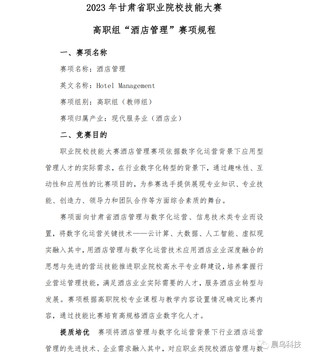 由甘肃省教育厅主办、甘肃工业职业技术学院承办、晨鸟科技/云驴通协办的2023年甘肃省职业院校技能大赛“中银杯”酒店管理赛项将于4月13日~15日进行。 比赛迎合酒店行业数字化运营背景下应用型管理人才的实际需求,通过趣味性、互动性和应用性的虚拟仿真酒店营运博弈,为参赛选手提供展现专业知识、专业技能、创造力、领导力和团队合作等方面综合素质的舞台。 比赛面向甘肃省酒店管理与数字化运营、信息技术类专业设置,将数字化运营涉及的云计算、大数据、人工智能、虚拟现实融入其中,实现酒店管理与数字化运营技术深度融合,可以有效推进职业院校高水平专业群建设,培养掌握行业营运管理技能,满足酒店业业实际需要的人才,服务酒店业转型与发展。 本次比赛包含三大模块,分别是选址筹建、数字化运营管理和智慧建设,其中选址筹建需要根据要求选择合适的酒店地理位置和规划酒店的配套设施;数字化运营管理需要根据要求完成人员管理、数字化营销、突发事件处理酒店运营,实现盈利;智慧建设需要根据要求将酒店打造成智慧型酒店,提升酒店运营效率,降低管理成本。 作为协办方,晨鸟科技将为本次比赛提供比赛平台——酒店管理营运博弈沙盘,该沙盘利用先进的多点触摸技术支持基于学生分组的多角色沙盘博弈,涵盖从酒店选址、客房管理、人事管理、客房营销、客户服务及基于行业数据财务部经营与管理等一系列功能,有助于培养学生的酒店营运与决策技能,可以有效支持高星级酒店管理人才教学与实训。参赛选手通过该沙盘进行回合制酒店管理仿真运营管理和博弈,在所有回合结束时,基于酒店盈亏情况为参赛选手进行客观打分,充分保证比赛的公平性。 本次比赛将为酒店管理与数字化运营、信息技术类等专业学生提供一个深入交流学习和展示自我的机会,欢迎相关专业学生踊跃报名参加! 详细赛项规程 请扫二维码进行查 晨鸟科技“云私塾”系列之电子商务、酒店数字化运营与管理、跨境电子商务、现代物流、区块链供应链金融、数字旅游营运管理等仿真博弈沙盘,以及基于区块链的远程技能竞赛可视化管理系统,均为行业首创、龙头产品,具有真实案例驱动、知识技能交融、技能素养并重、竞赛管理赋能、数字助教赋能等产品特色,全国200多所院校获得成功应用。 晨鸟科技“云私塾”系列产品,基于多点触摸的并发协作,以及区块链、云计算与非合作博弈理论,突破了多小组、多角色、多轮次、多回合的沙盘营运管理博弈模型关键技术,可以真实生动的再现专业场景,不但保留了传统沙盘的本色,还提供面向教师的实验管理、评价分析、过程监控的后台管理,可以方便快捷、多维度、全过程采集学生实训数据,进行可视化实时状态分析及统计。联系邮箱sunwenjie@chenniao.com,专业服务请致电400-820-3886。 |